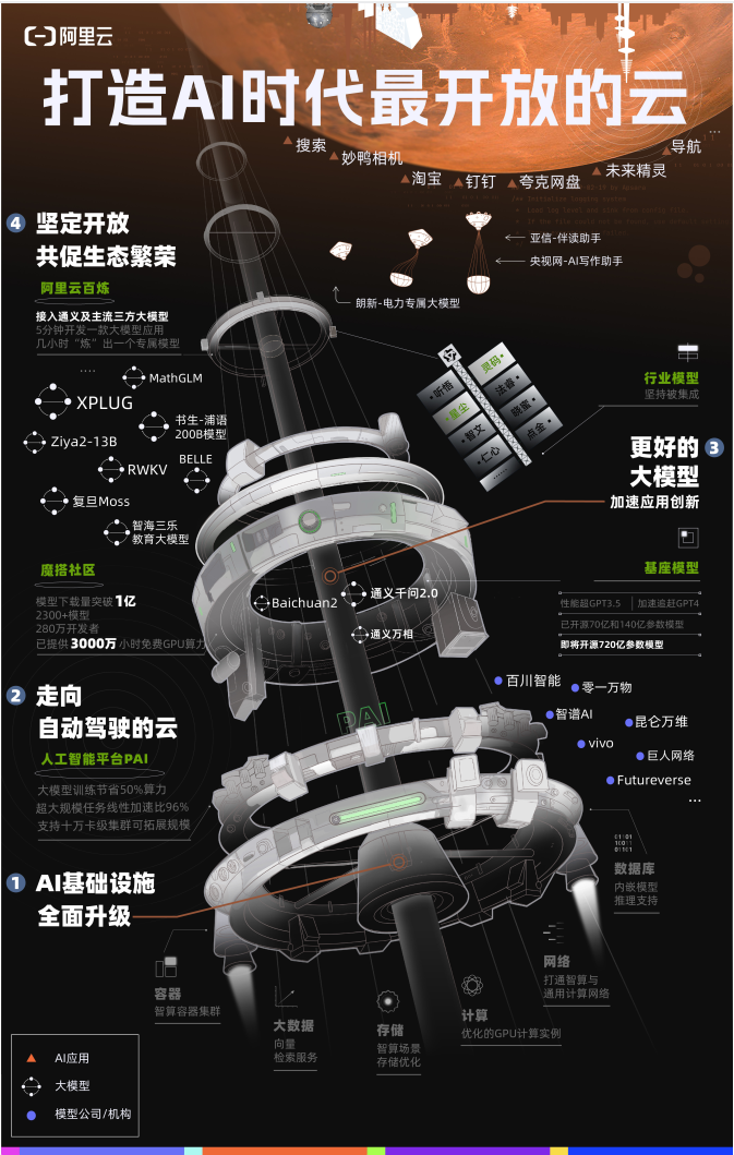 本年,阿里云上有跨越30款云产物接入了大模子能力,并发布千亿级参数规模的大模子通义千问2.0,周靖人颁布发表通义千问72B模子即将开源,累积用户超100万。供给3000余个边缘计较节点,将成为中国参数最大的开源模子。魔搭社区现已堆积2300多款AI模子,阿里云则为开辟者们“尝鲜”大模子供给免费GPU算力,百川智能创始人兼CEO王小川暗示,阿里云已正在全球30个地区扶植了89个云计较数据核心,截至目前,